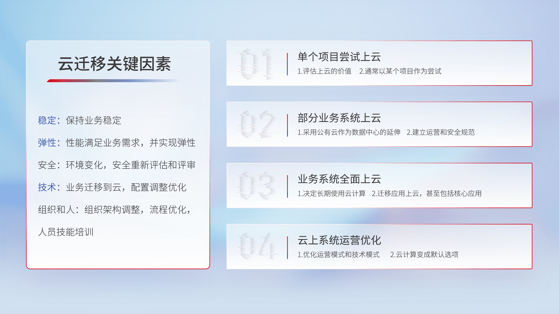 结合实际业务,,,,从规划设计、、云平台选型、、、云原生改造、、、、数据迁移、、、、集成交付,,,迁移全过程为客户识别最佳上云路径,,做好风险识别管理,,设计网络架构、、身份权限、、安全审计合规、、、操作审计、、日志审计、、、、监控告警策略、、、、多站点容灾设计等,,对云上基础设施进行整体规划,,,提升IT治理水平,,以满足弹性、、高可用、、、高性能的需求。。。。